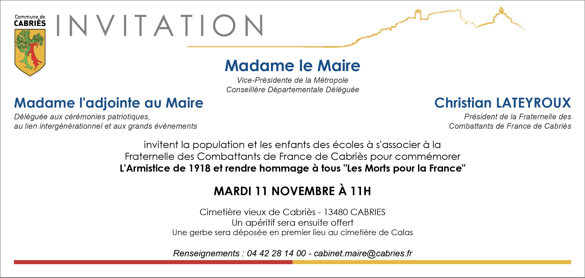 « Tous les Évènements 11 novembre 1918 : Commémoration de la signature de l’Armistice de 1918 mettant fin à la Première Guerre mondiale mardi 11 novembre 2025 11 h 00 min - 12 h 00 min CET « Loto de l’association Le Cœur de Léa Concert classique : Une soirée au salon viennois de 1815 » Le mardi 11 novembre à 11h + Google Agenda+ Exporter vers iCal Détails Date : mardi 11 novembre 2025 Heure : 11 h 00 min - 12 h 00 min Catégorie d’Évènement: Commémoration Organisateur Municipalité de Cabriès Lieu Cimetière de Cabriès Cimetière de Cabriès Cabries, 13480 France + Google Map