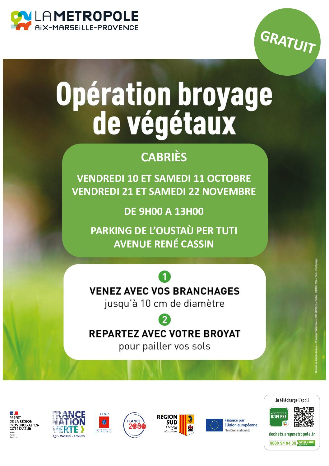 « Tous les Évènements Broyage des déchets verts vendredi 10 octobre 2025 9 h 00 min - samedi 11 octobre 2025 13 h 00 min CEST « Octobre rose : Ballet – Néréides + conférence Braderie du Foyer St Raphaël » Le 10 et le 11 octobre de 9h à 13h + Google Agenda+ Exporter vers iCal Détails Début : vendredi 10 octobre 2025 9 h 00 min Fin : samedi 11 octobre 2025 13 h 00 min Catégorie d’Évènement: Environnement Organisateur Municipalité de Cabriès Lieu Parking de l’Oustaù Per Touti 8493 Av. René Cassin Cabriès, 13480 France + Google Map