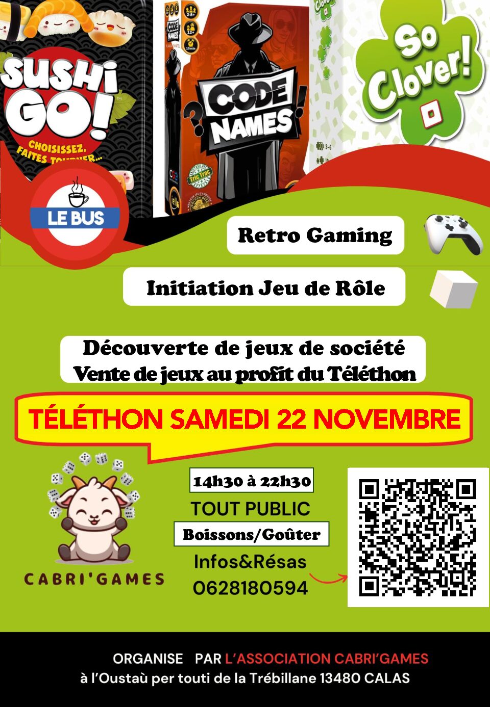 Infos & réservation : https://www.helloasso.com/associations/cabri-games/evenements/samedi-jeux-22-nov-telethon