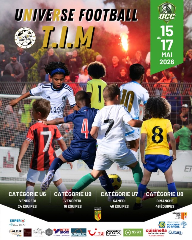« Tous les Évènements Universe Football TIM par l’OCC vendredi 15 mai 2026 - dimanche 17 mai 2026 « Les lundis de l’IESM Concert : Divin’Gospel MEN » Du 15 au 17 mai au Complexe sportif Raymond Martin Informations : https://www.facebook.com/permalink.php?story_fbid=pfbid088t4sub1XgyKiCENYmoCaFr5NCVVP6JiPPYmDuRzaHjh9DWCoUZu2HfPDgHkYA5Yl&id=61579881096183 + Google Agenda+ Exporter vers iCal Détails Début : vendredi 15 mai 2026 Fin : dimanche 17 mai 2026 Site Web : https://www.facebook.com/permalink.php?story_fbid=pfbid088t4sub1XgyKiCENYmoCaFr5NCVVP6JiPPYmDuRzaHjh9DWCoUZu2HfPDgHkYA5Yl&id=61579881096183 Organisateur OCC – Olympique Cabriès Calas Lieu Complexe Sportif Raymond Martin Complexe sportif Raymond Martin Cabriès, 13480 + Google Map