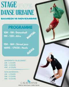 Le 15 novembre 10h : Dancehall 11h : Afro 15h : Street Jazz 16h15 : Heels Au profit du Téléthon