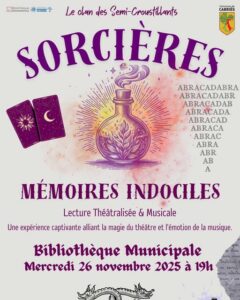 Le 26 novembre à 19h Entrée libre Le Clan des Semi Croustillants vous invite à une lecture musicale envoûtante autour des sorcières dans la littérature — ces femmes libres, puissantes et souvent incomprises. Entre mots et musique, venez prêter l’oreille à la mémoire des indociles et laissez la magie des textes opérer… Une soirée littéraire et musicale magique !