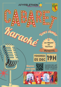 Le vendredi 5 décembre à 19h Réservation : https://www.billetweb.fr/cabaret-karaoke-au-profit-du-telethon&multi=19484&color=C14238&parent=maisondesartsdecabries&color=C14238&from_multi=1 Au profit du Téléthon