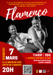 Le 7 mars à 19h à l'auditorium de la Maison des Arts Réservation : https://www.helloasso.com/associations/ciq-cabries-village/evenements/spectacle-flamenco-1