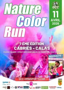 Le 11 avril sur la Plaine Saint-Martin Informations et inscriptions : https://www.helloasso.com/associations/olympique-cabries-calas/evenements/nature-color-run-2026-classic?fbclid=IwY2xjawQwyAZleHRuA2FlbQIxMABzcnRjBmFwcF9pZBAyMjIwMzkxNzg4MjAwODkyAAEe1fiHrdpH9-aA2I6EFM2-JlcYqHS_7sq4fqALjRvUdBLig5qo892jeytLMg8_aem_j8EWu-fFzWtIUlC4hQgcrQ 10:30 Ouverture du site et des inscriptions + retraits des packs 10:30 Ouverture buvette 11:30 Ouverture foodtrucks midi 11:30/15:00 Animations village partenaires** 15:30 Début arrivé grand public 17:00 Début de l’échauffement en musique 17:30 Départ JET DE POUDRE COLLECTIF à la fin de la course 18:30/19:00 Animations** 19:00 Début de l’after 19:00 Ouverture des foodtrucks soir 23:00* Fin de l’after “RUN TO PARTY”